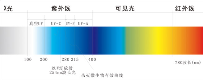 根据生物效应的不同,紫外线按照波长划分为A波段、B波段、C波段及D波段四个部分。C波段紫外线具有使细菌、病毒、芽孢以及其它病原菌的DNA丧失活性,从而破坏它们的复制和传播疾病的能力,所以水消毒主要采用的是C波段紫外线。